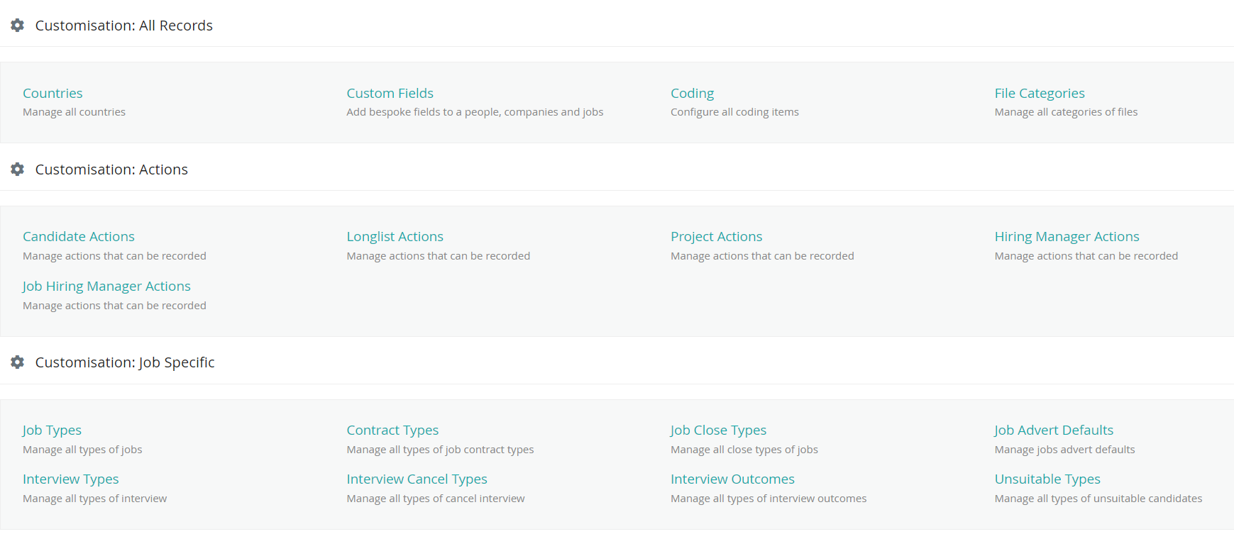 - Longlist Actions: actions you want to record against a person as a candidate from within a job longlist such as phone call, sent CV, conducted interview prep, etc.