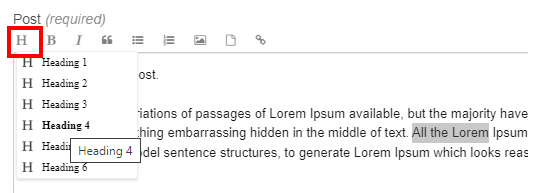 To add headings of different sizes, highlight the text and select the heading size using the “H” dropdown.