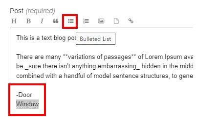 Next option is bullet points, if you are to put a “-“ before a row of text this will make it a bullet point. You can also highlight the text and press the bullet point button to have this put in for you.